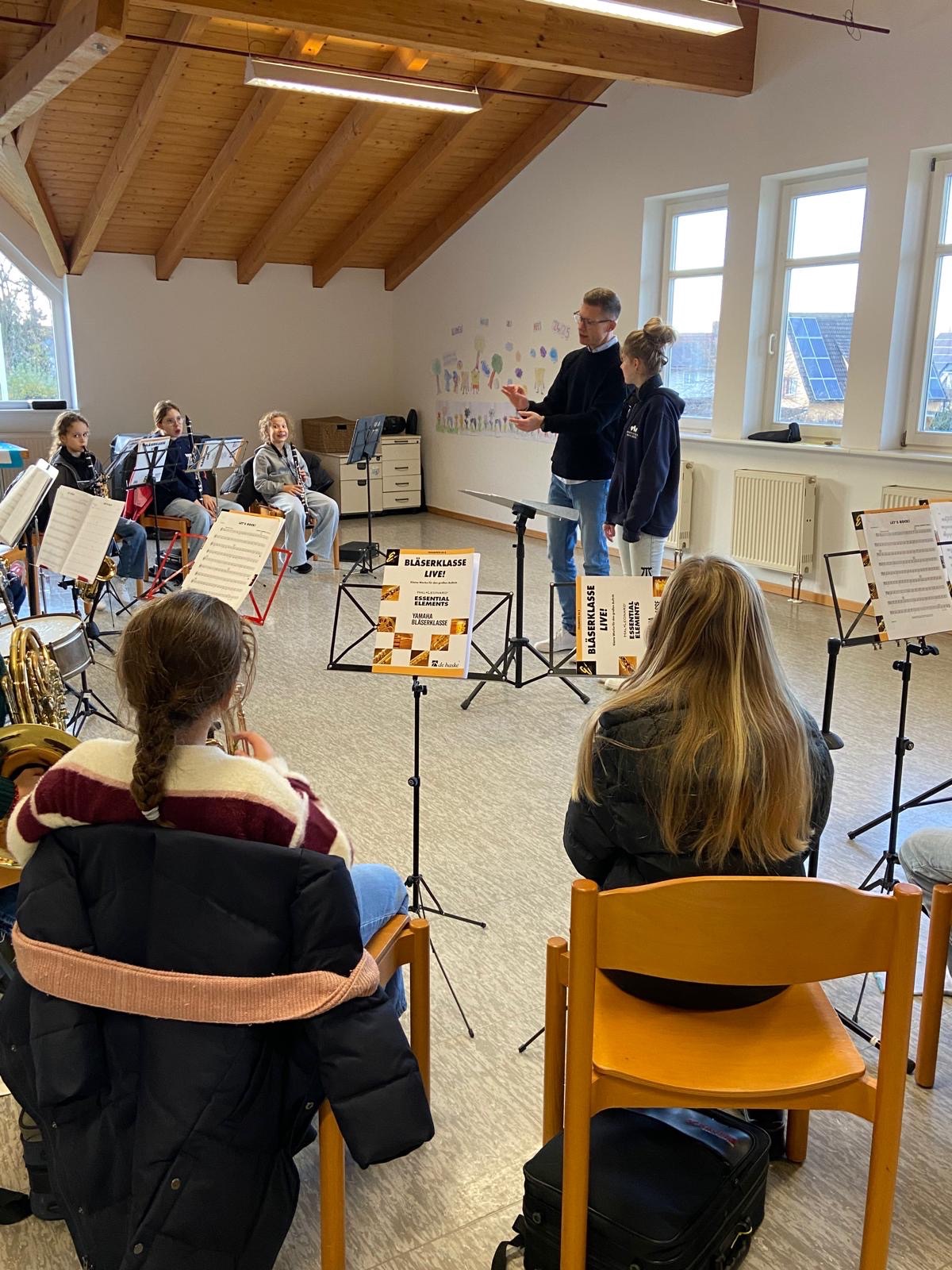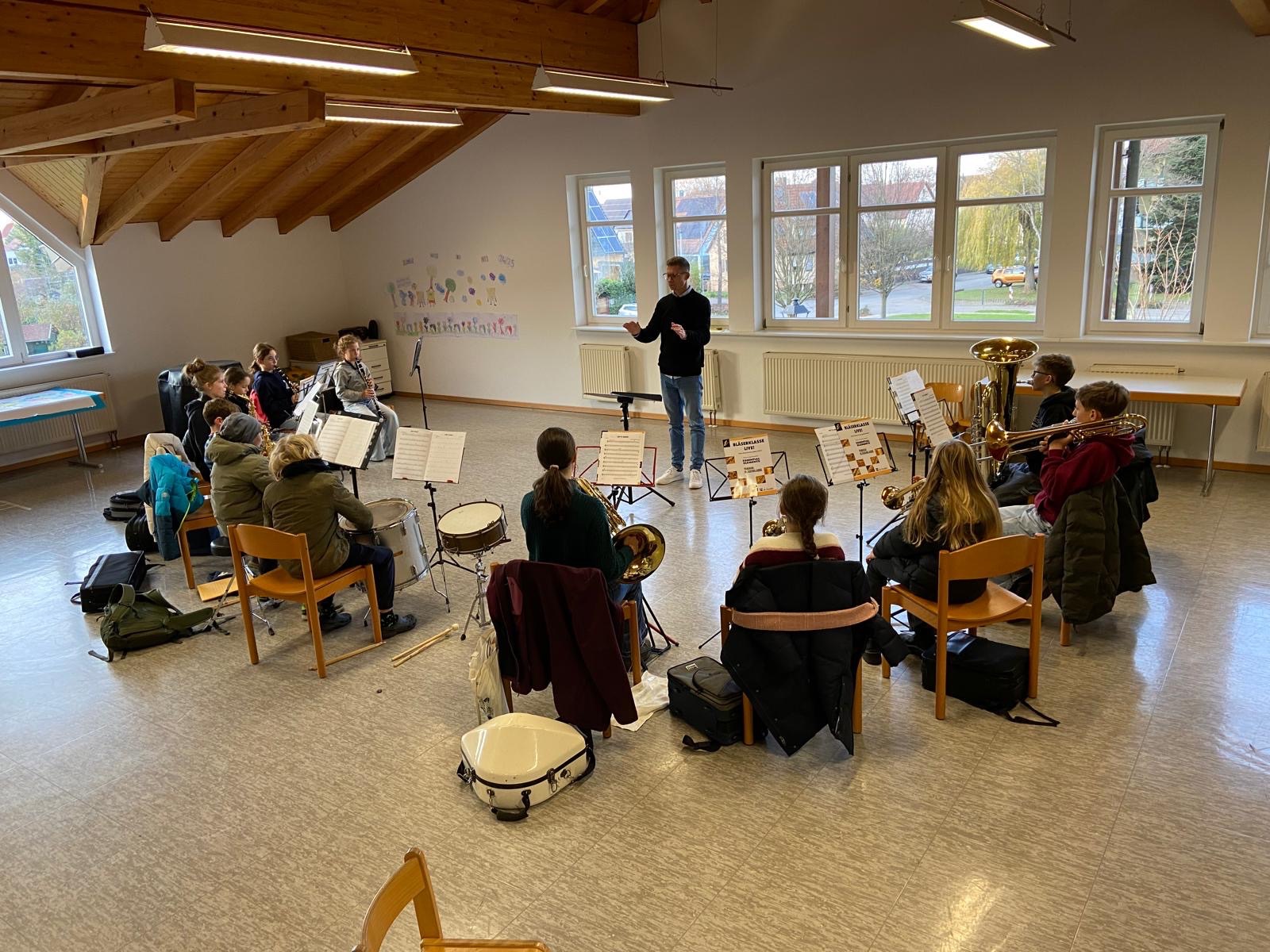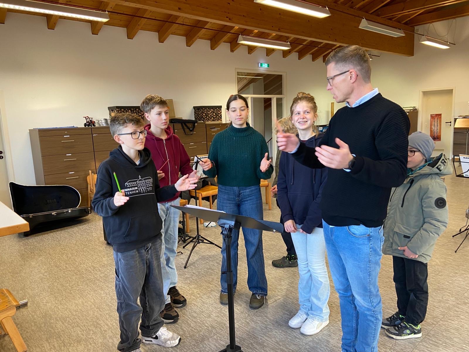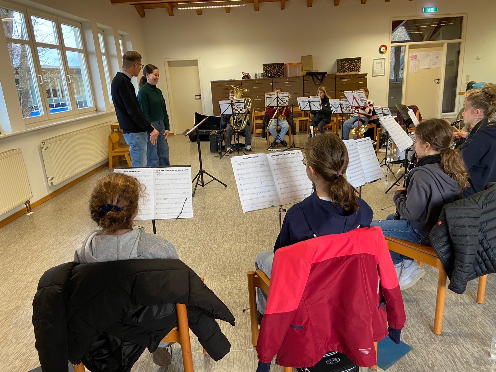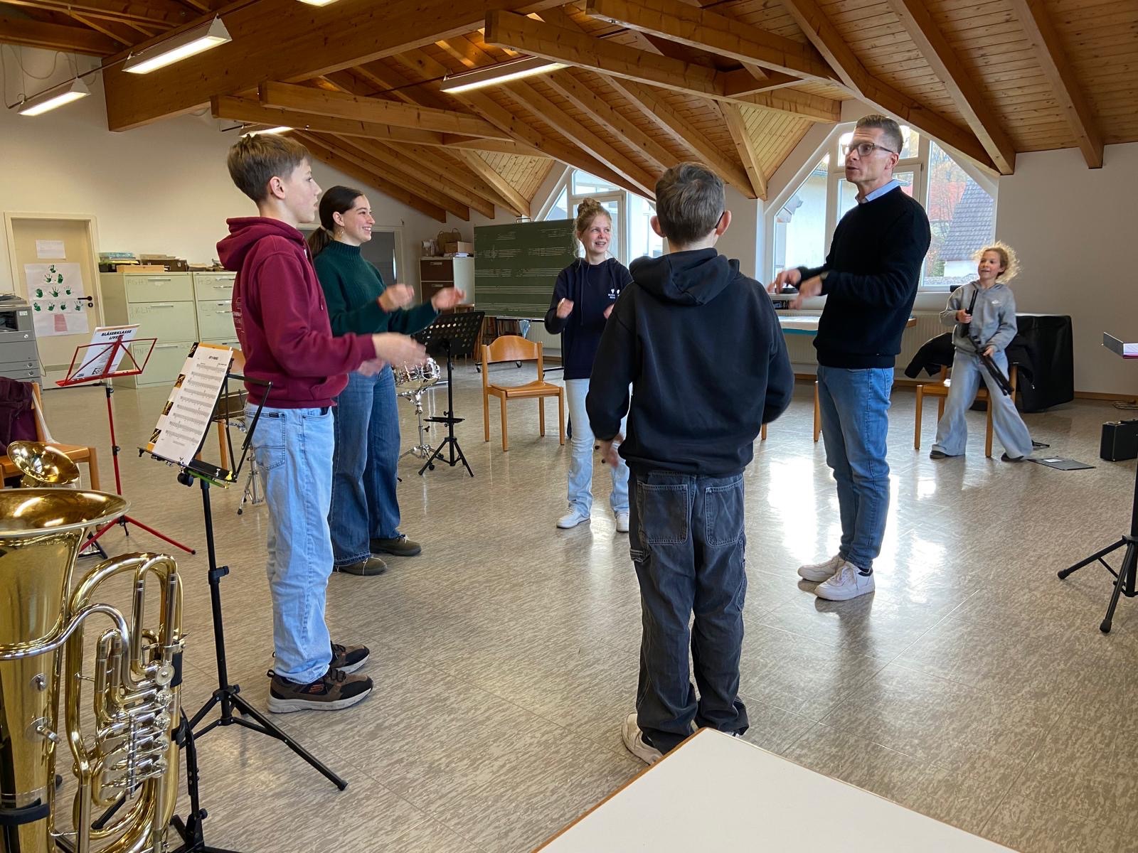 Mit viel Spaß und Empathie führte er die Vier zuerst in kleinem Kreis in die Welt des Dirigierens ein. Danach konnte das Gelernte direkt in der Vororchester-Probe umgesetzt werden. Stefan gab immer wieder Tipps und verriet auch einige Tricks zur Probenarbeit. Auch unsere Musiker und Musikerinnen des Vororchesters waren sichtlich beeindruckt.