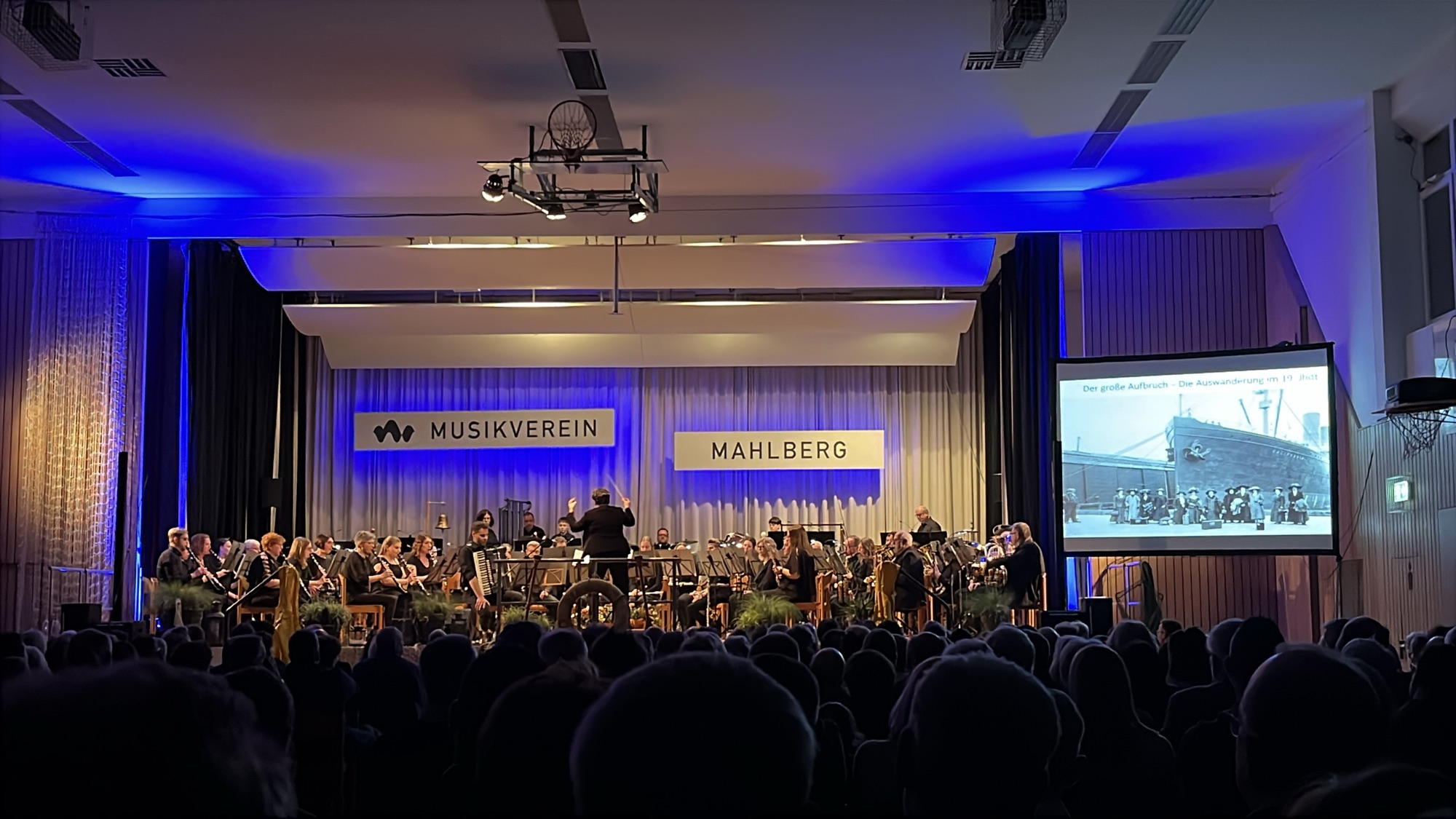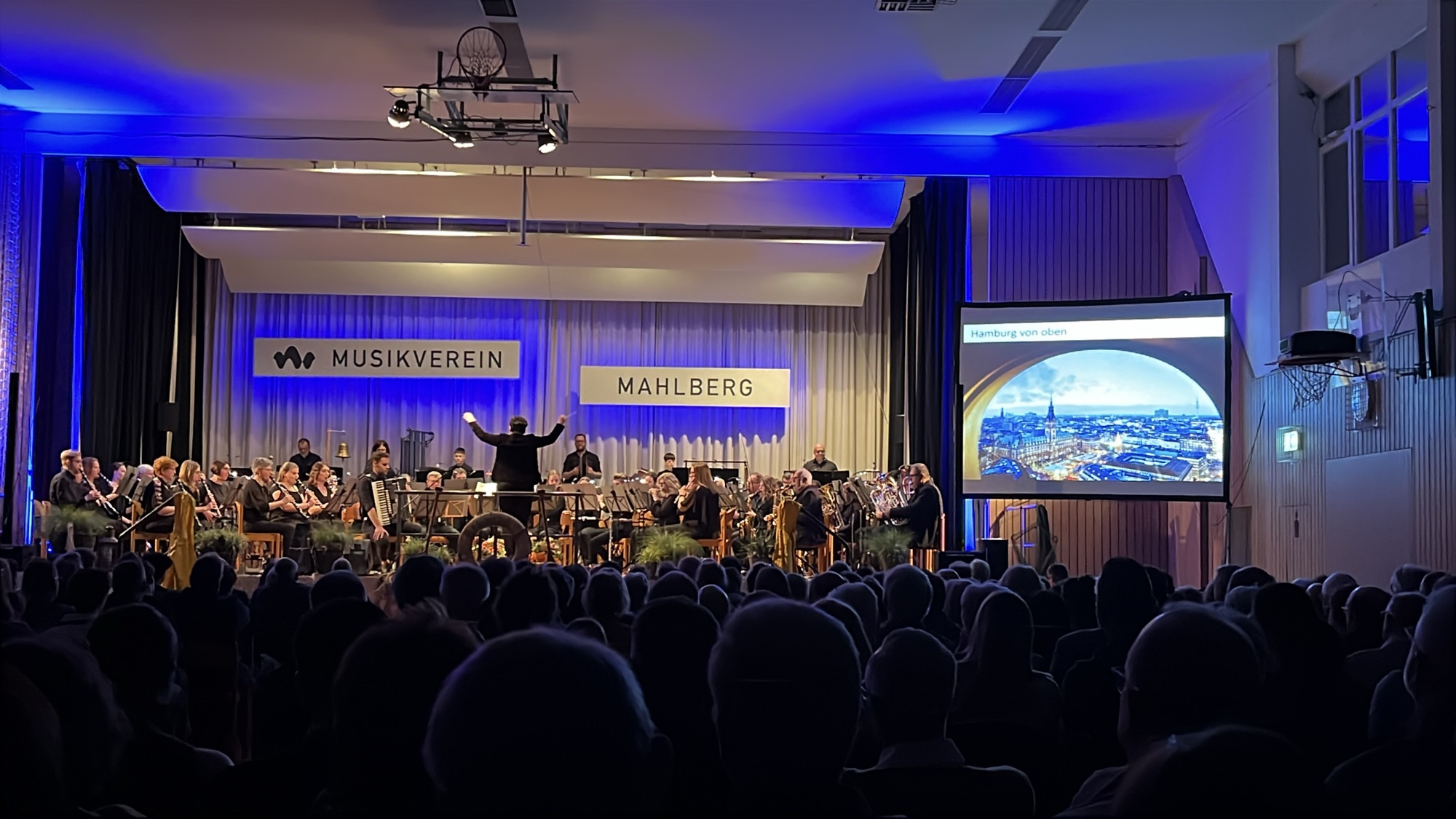 Danach kamen wir mit „Hamburg – Das Tor zur Welt“ zu einem Höhepunkt unseres Konzertes. Guido Rennert beschreibt in diesem gut 20-minütigen Werk die Weltstadt von der Hanse bis zur Gegenwart. Das Publikum folgte uns begeistert durch die Jahrhunderte und wurde mit zur Musik passenden Projektionen auf die Geschehnisse in der Komposition aufmerksam gemacht. Wir wurden von David Blasen am Akkordeon unterstützt. Die Klänge des Akkordeons machten das Musikstück erst vollkommen.