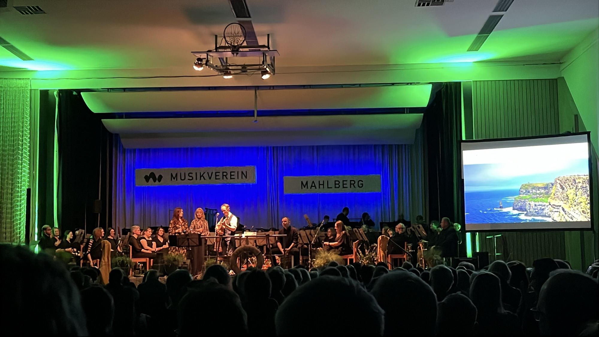Unsere Künstlerin des Abends Katja Schneider, die mit Ihren Bildern Irland in die Stadthalle gebracht hat, singt auch und hat ihre Schwester Doris Suhm und den Iren Fintan Lucy mitgebracht. Sie haben „The West Awake“ extra für unser Konzert in ihr Programm aufgenommen und wurden von Annette Burger und Daniel Beck begleitet.